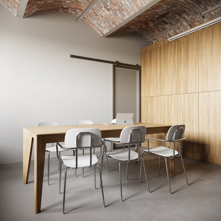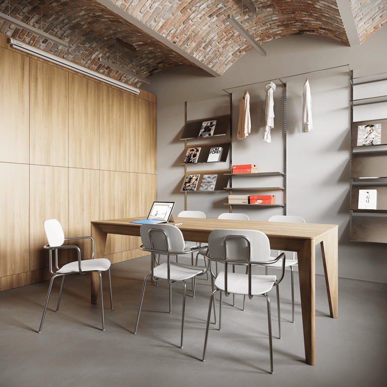 Biuro wraz z częścią magazynową sklepu odzieżowego w przyziemiu zabytkowej kamienicy na krakowskim Kazimierzu. Reprezentacyjne dla pomieszczenia, ceglane sklepienia kolebkowe zostały gruntownie odnowione oraz odpowiednio wyeksponowane w celu zachowania autentycznego charakteru wnętrza. Towarzyszą im stonowane kolory oraz jasne tonacje drewna dębowego. Ze względu na niewielką przestrzeń, całość dyskretnie dopełniają systemowe rozwiązania do przechowywania.