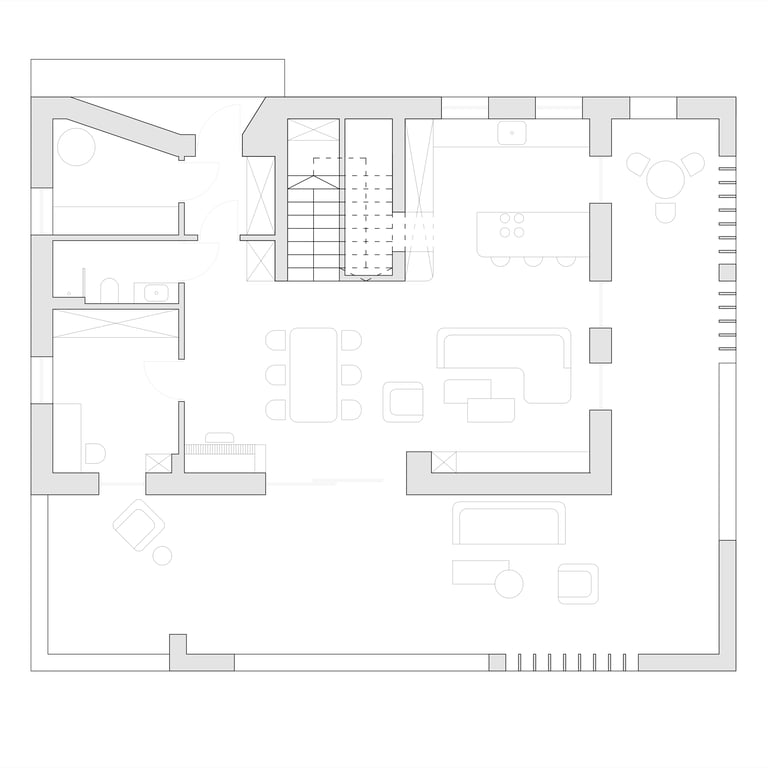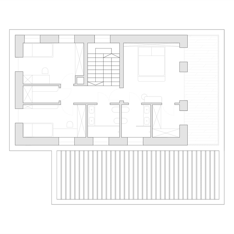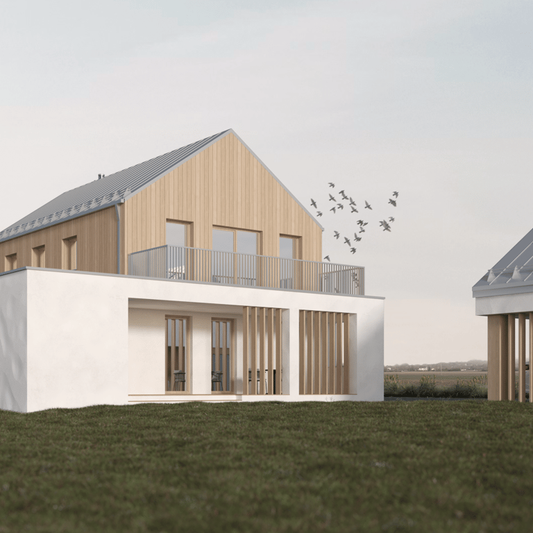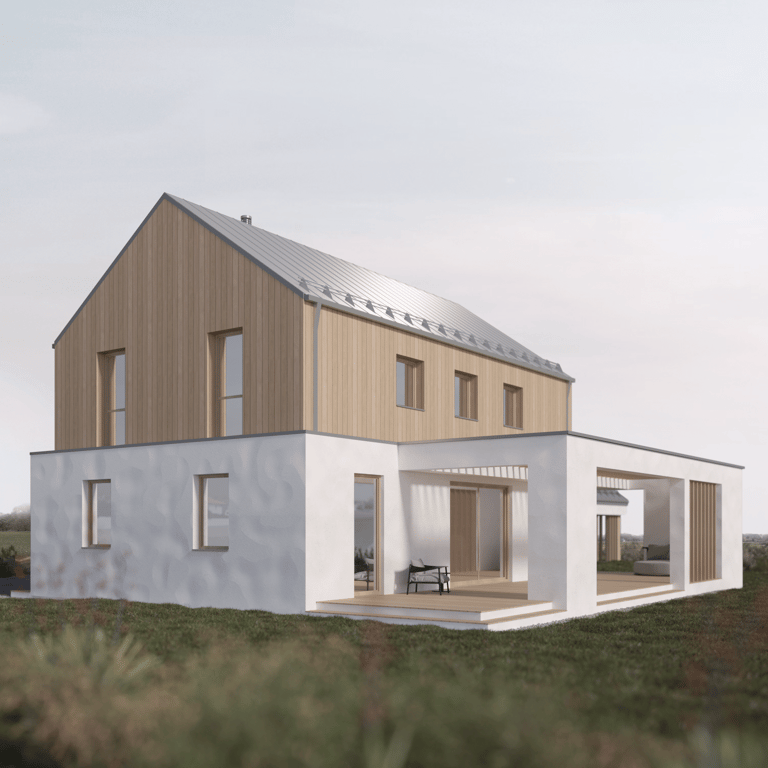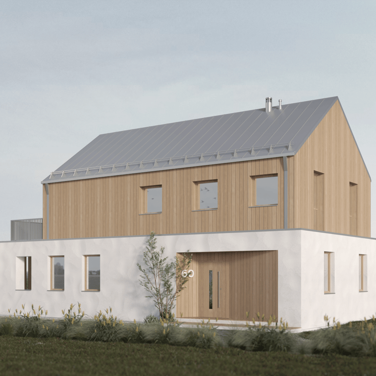 Dom młodego małżeństwa położony w spokojnej, wiejskiej okolicy doliny rzeki Mleczki. Koncepcja budynku opiera się na czytelnym podziale na dwie bryły odpowiadające kondygnacjom. Parter wykończono rustykalnym tynkiem wapiennym, przywodzącym na myśl architekturę śródziemnomorską, piętro natomiast obłożono deskami z naturalnego drewna w ciepłym odcieniu. Kompozycję dopełnia wolnostojący garaż, stanowiący formalny rewers dla domu. Część dzienną zaprojektowano tak, by wnętrze płynnie przenikało się z otoczeniem. Kuchnia otwiera się na kameralną, półotwartą przestrzeń ukrytą pod balkonem głównej sypialni, a przestronny salon rozszerza się o główny taras, zadaszony łamaczami światła, które tworzą przyjemny mikroklimat w letnie popołudnia. Na parterze znajduje się także biuro pana domu – zawodowego muzyka – odpowiednio przystosowane akustycznie i posiadające indywidualne wyjście na półprywatną część tarasu.
