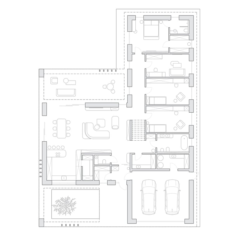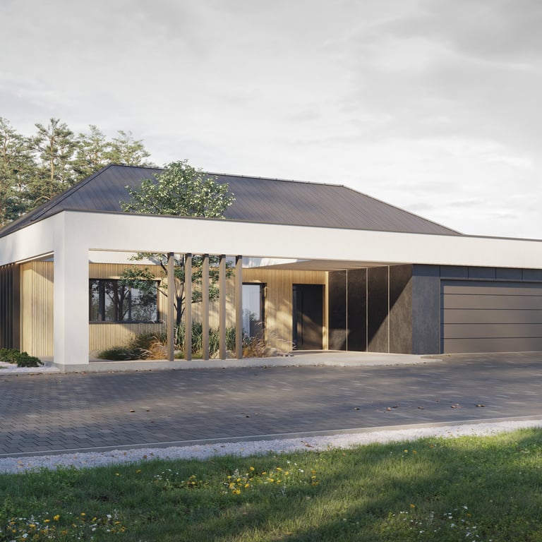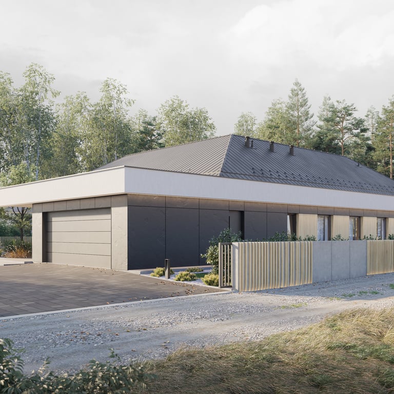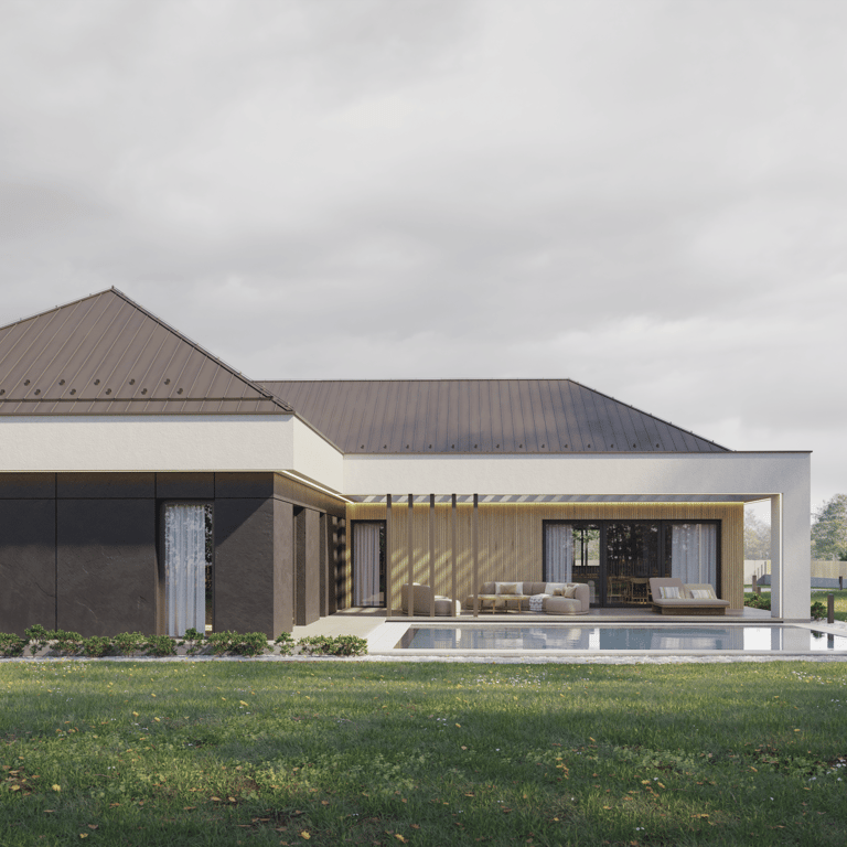Parterowy dom położony na skraju półprywatnego, brzozowo-iglastego lasu. Budynek zaprojektowano na planie półkrzyża, którego centralny punkt stanowi przestronna strefa dzienna z jadalnią. Otwiera się ona bezpośrednio na zadaszony taras przy basenie, zacierając tym samym granicę między wnętrzem a otoczeniem. Elewację wykończono kontrastowymi materiałami: lamelami z naturalnego jesionu oraz czarnymi płytami kompozytowymi o strukturze kamienia. Wizualną klamrę dla całości stanowi swoista biała rama. Od frontu wydziela ona reprezentacyjny podcień wejściowy z przenikającą go zielenią, natomiast w części prywatnej ogrodu formuje zadaszenie z łamaczami światła.