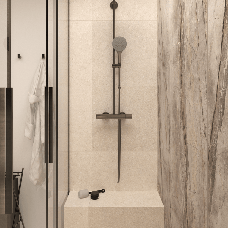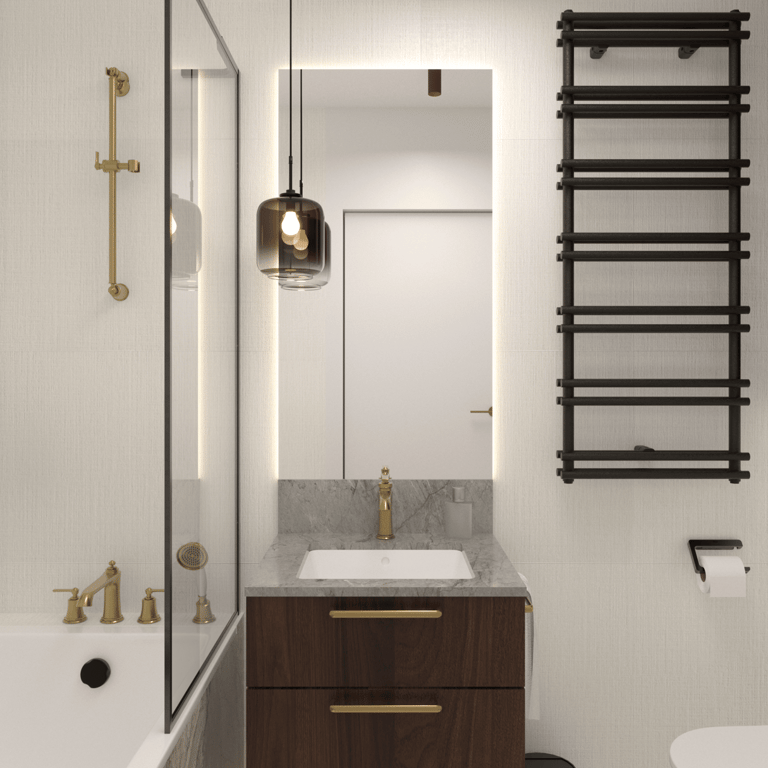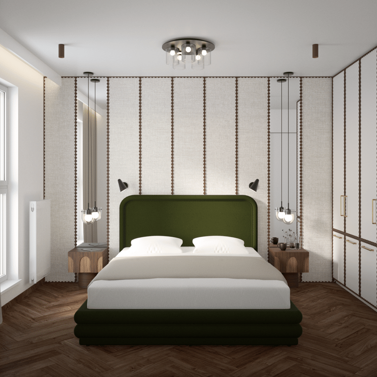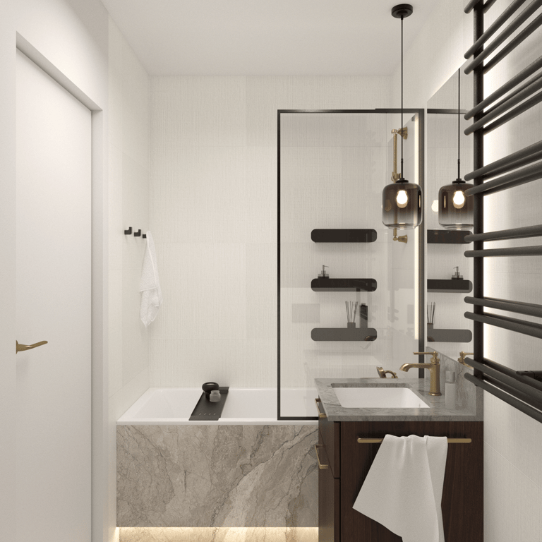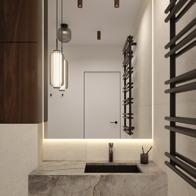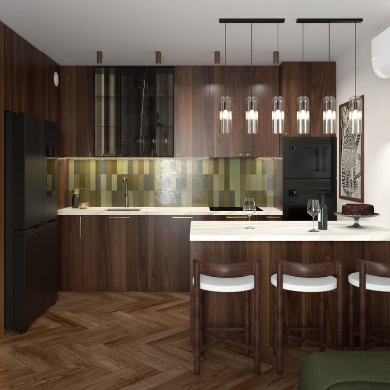 Apartament dla pary ceniącej sobie spotkania w gronie przyjaciół i rodziny, wnętrza o ciepłym, przytulnym charakterze, a także wyszukane wzornicze akcenty. Projekt czerpie z japońskiej filozofii Wabi Sabi oraz subtelnych kolorów natury, dopełnionych detalami z postarzanego mosiądzu i ryflowanego szkła. Nietypową dekorację strefy dziennej stanowi sufit w korytarzu, ozdobiony kolekcją pamiątkowych łyżeczek, które inwestorzy kolekcjonują podczas swoich podróży.