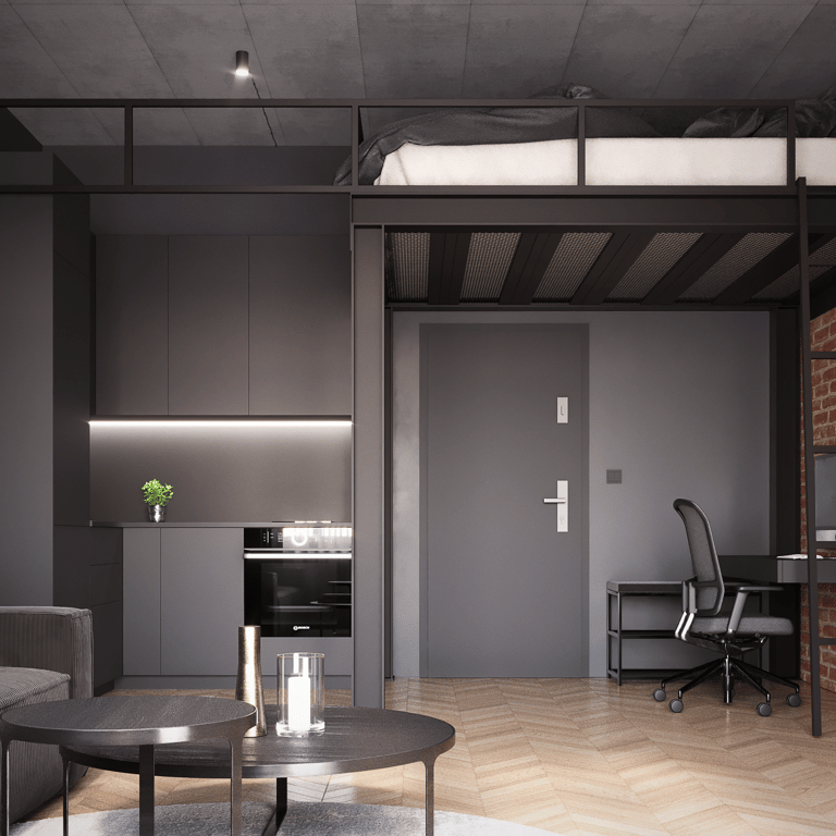 Kameralna kawalerka dla singla, któremu zależało na stworzeniu surowej, a zarazem eleganckiej przestrzeni. Strefy w mieszkaniu wydziela stalowa antresola, dzięki której, pomimo niewielkiego metrażu, uzyskano zarówno wygodne miejsce do pracy, jak i komfortowe, pełnowymiarowe łóżko. Monochromatyczna paleta barw, ceglana ściana oraz odkryta konstrukcja żelbetowego stropu, dodają całości męskiego, industrialnego charakteru.