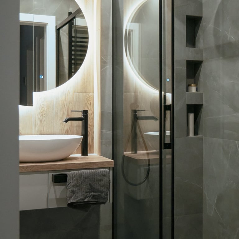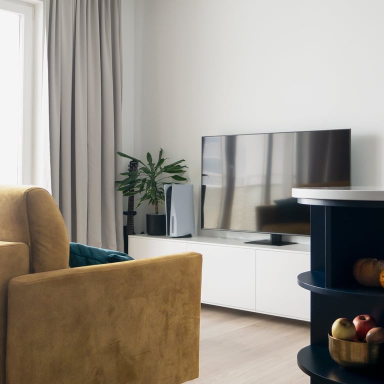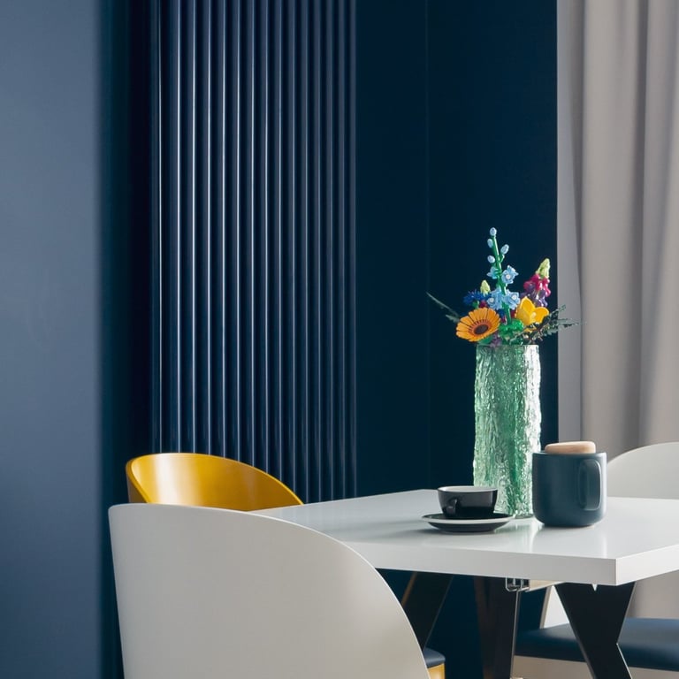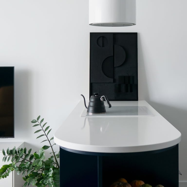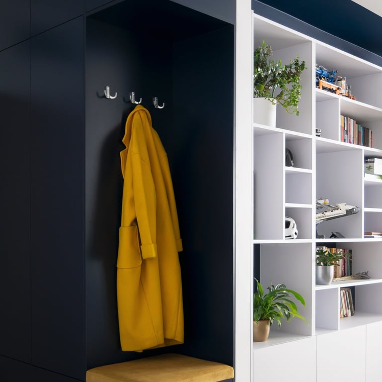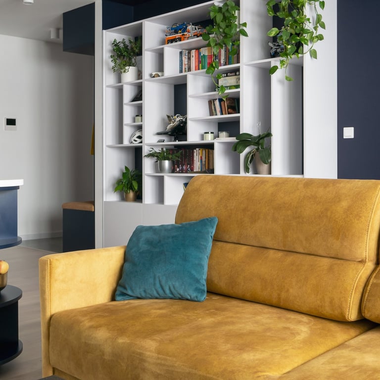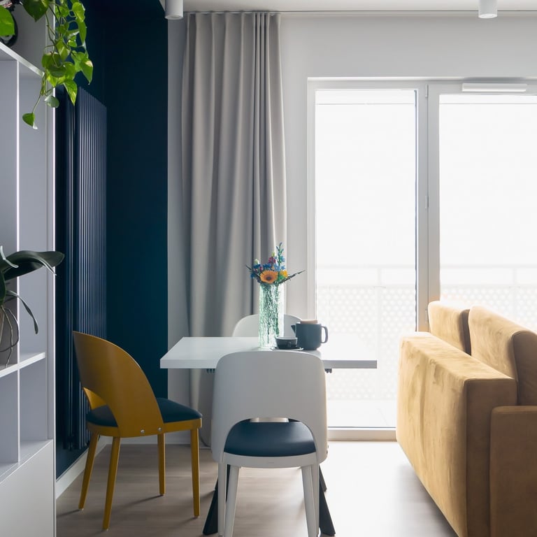 Apartament dla pary na nowym osiedlu w Krakowie, zlokalizowanym w pobliżu zalewu Bagry. Projekt przewidywał opracowanie nowoczesnych eklektycznych wnętrz, przy użyciu stonowanych barw z mocnymi akcentami kolorystycznymi. Główną ideą było połączenie strefy życiowej oraz miejsca do pracy. Aranżacja sprostała oczekiwaniom klientów, którym zależało na uzyskaniu jak największej przestrzeni do przechowywania, oraz stworzeniu w pełni funkcjonalnej łazienki pomimo jej niewielkich wymiarów.