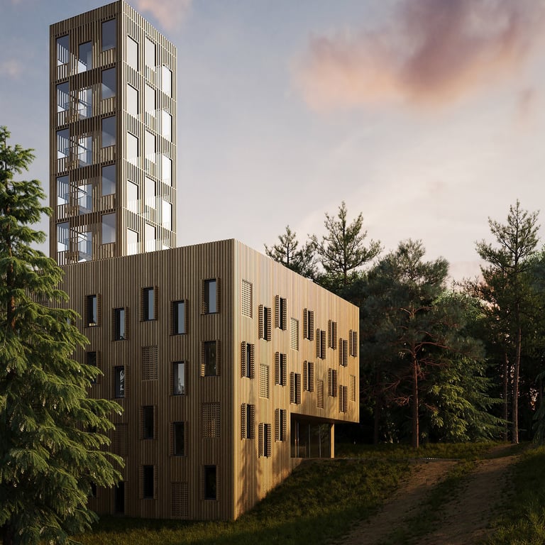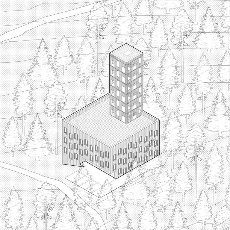 Projekt konkursowy na opracowanie koncepcji architektonicznej dla schroniska turystycznego, zlokalizowanego na górze Jeżowa Woda w Beskidzie Wyspowym. Budynek odwołuje się do architektury elementarnej, proponując bryłę skromną i jednocześnie atrakcyjną w swojej prostocie. Jednymi z głównych wytycznych konkursu były: nawiązanie do budownictwa regionalnego oraz ochrona środowiska przed zanieczyszczeniem światłem. Odpowiedzią na te wymagania było zastosowanie w obiekcie drewna jako głównego materiału zarówno konstrukcyjnego, jak i wykończeniowego oraz zaprojektowanie składanych okiennic.