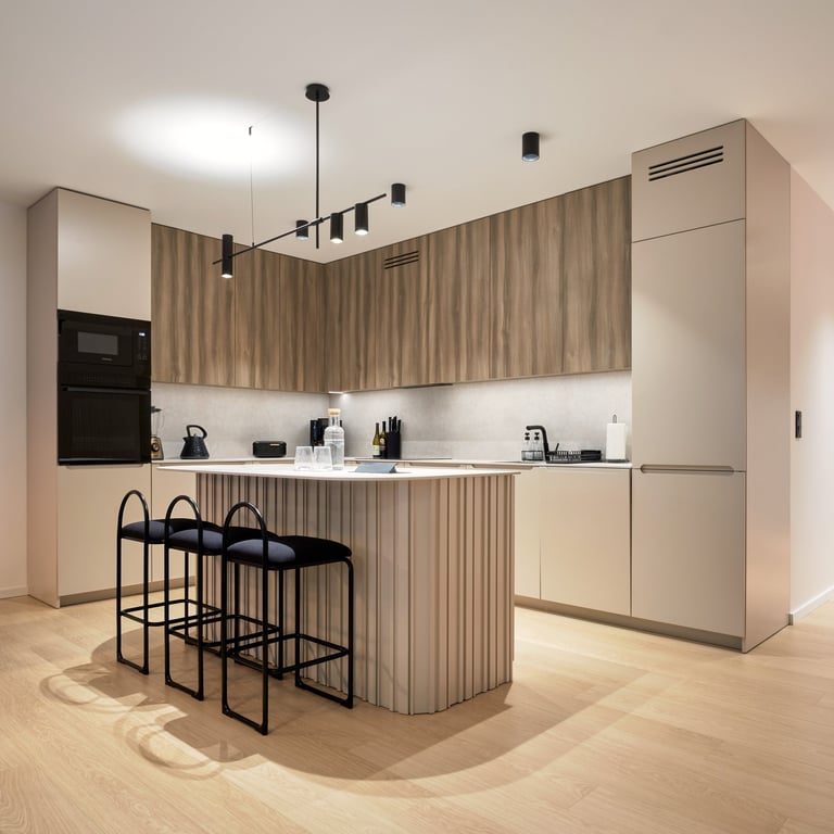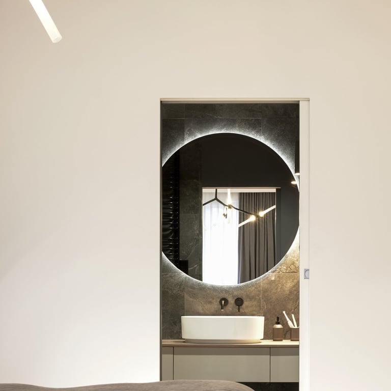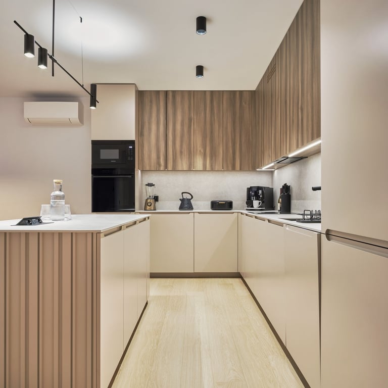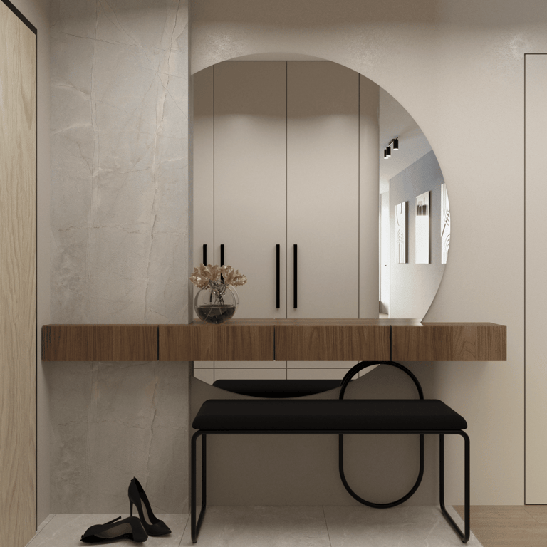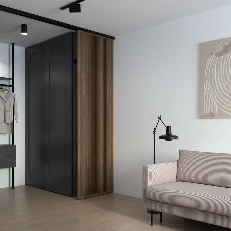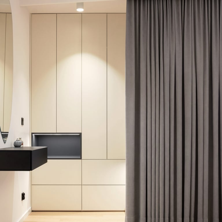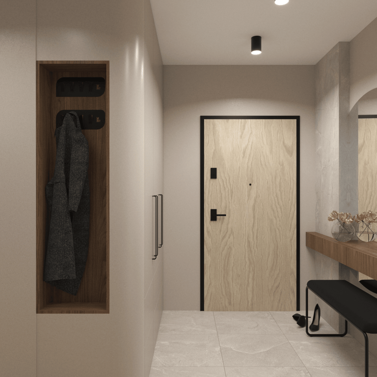 Apartament będący mieszanką stylu nowoczesnego i japandi. Stonowane beże i szarości wraz z drewnem i kilkoma rodzajami kamienia, tworzą harmonijną kojącą przestrzeń. Całość podkreślają minimalistyczne czarne dodatki oraz wysokiej klasy wzornictwo. Rearanżacja układu ścian we wnętrzach pozwoliła m.in. na uzyskanie dodatkowej, ukrytej w biurze garderoby.