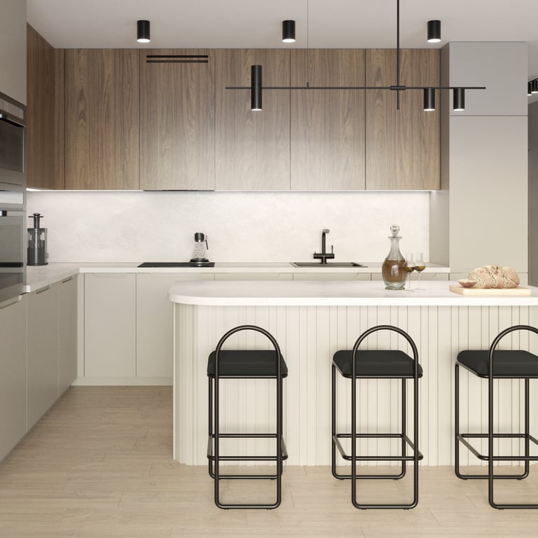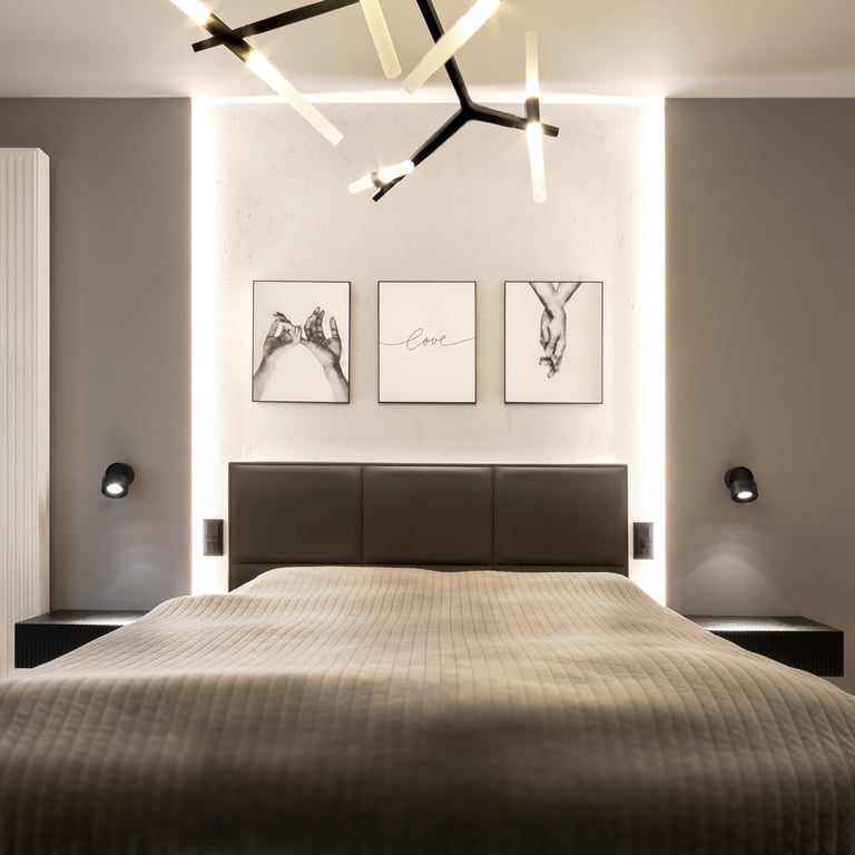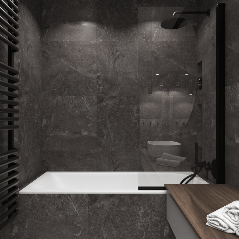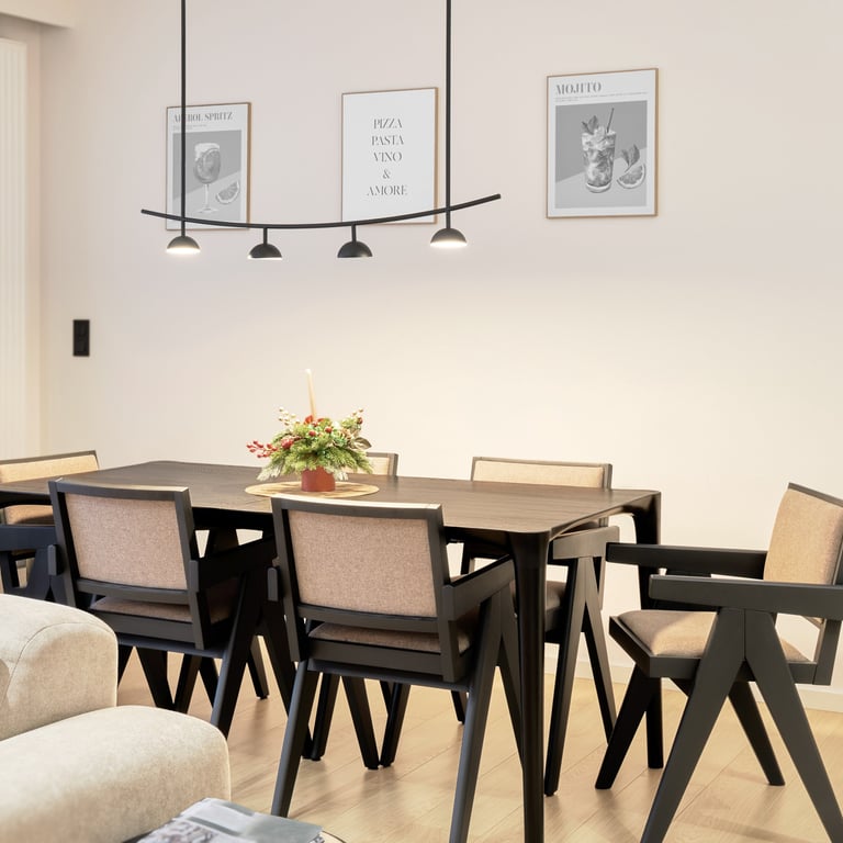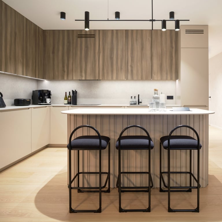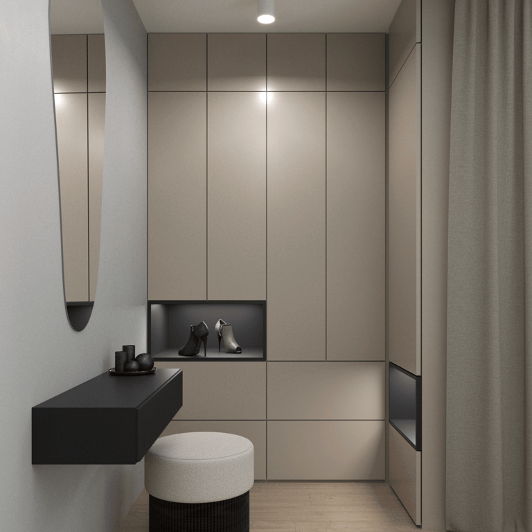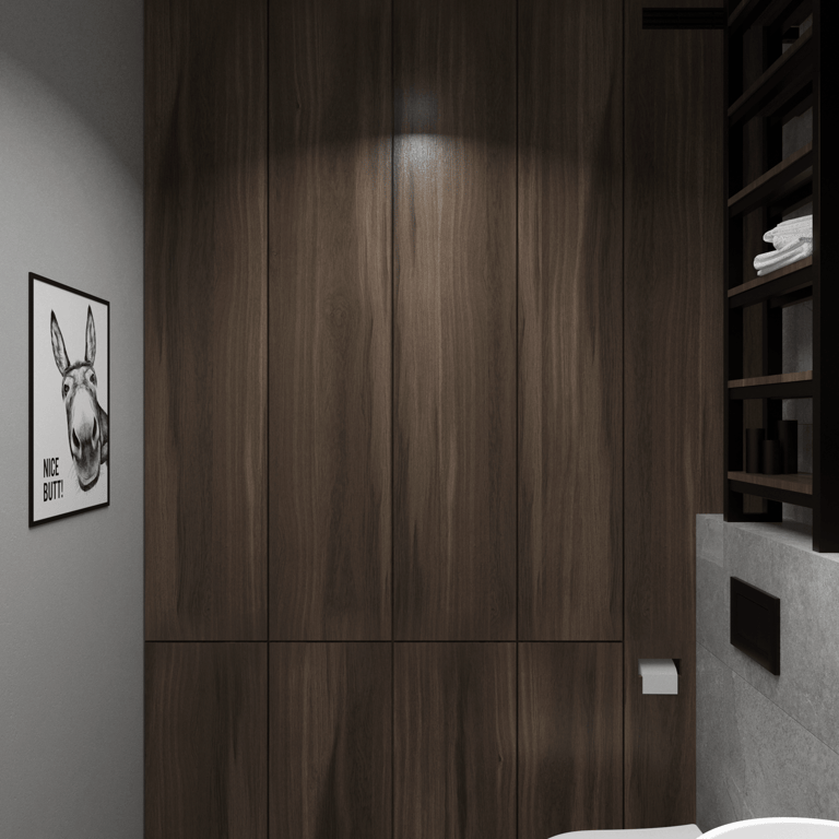 Apartament będący mieszanką stylu nowoczesnego i japandi. Stonowane beże i szarości wraz z drewnem i kilkoma rodzajami kamienia, tworzą harmonijną kojącą przestrzeń. Całość podkreślają minimalistyczne czarne dodatki oraz wysokiej klasy wzornictwo. Rearanżacja układu ścian we wnętrzach pozwoliła m.in. na uzyskanie dodatkowej, ukrytej w biurze garderoby.