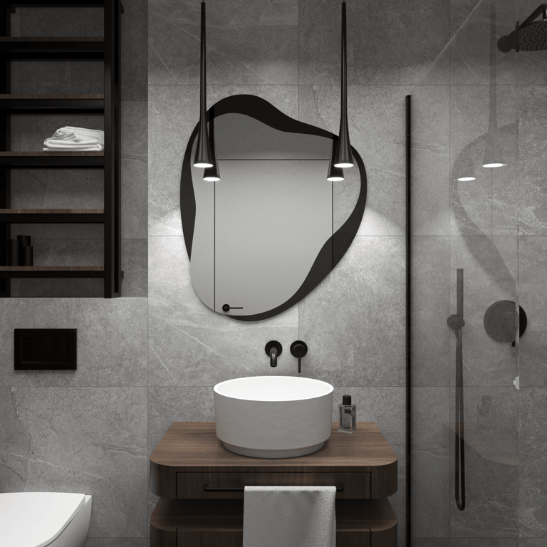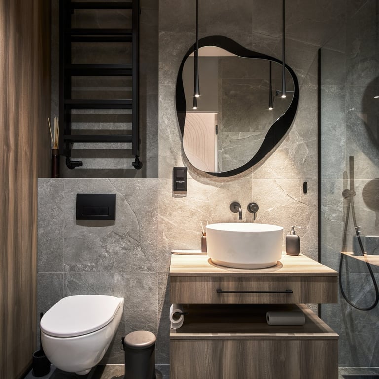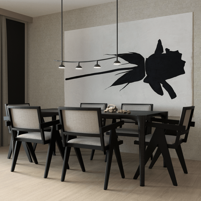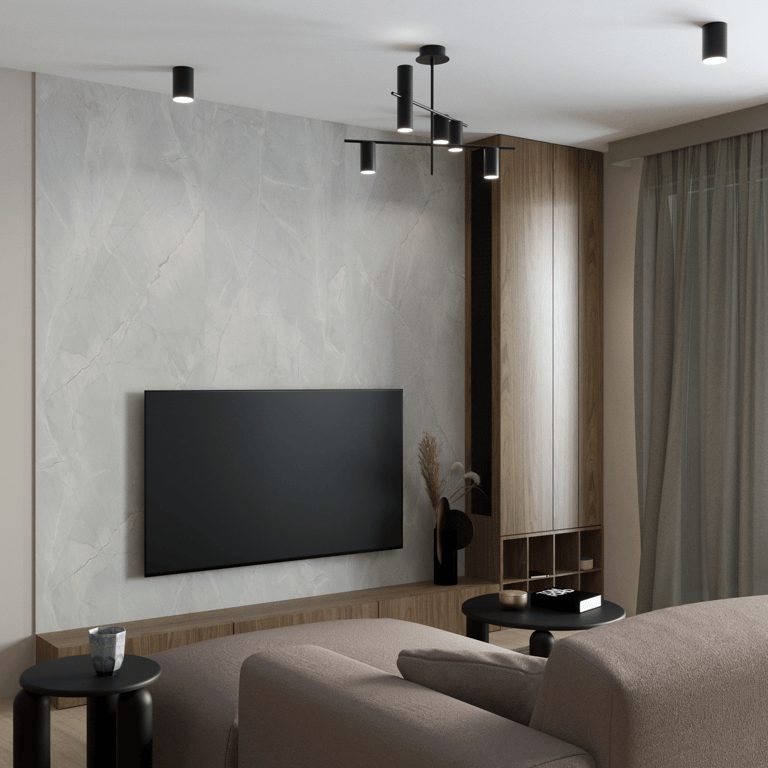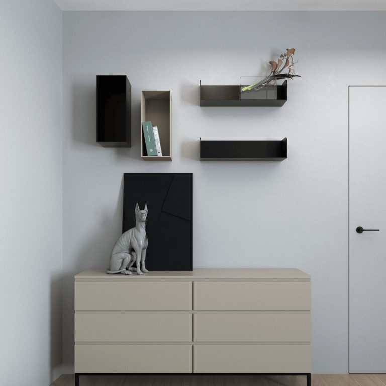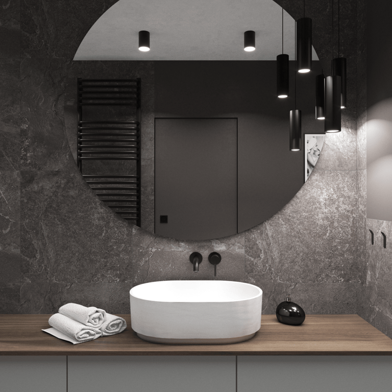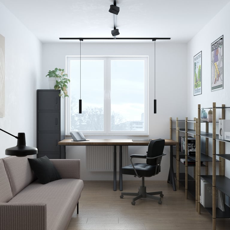 Apartament będący mieszanką stylu nowoczesnego i japandi. Stonowane beże i szarości wraz z drewnem i kilkoma rodzajami kamienia, tworzą harmonijną kojącą przestrzeń. Całość podkreślają minimalistyczne czarne dodatki oraz wysokiej klasy wzornictwo. Rearanżacja układu ścian we wnętrzach pozwoliła m.in. na uzyskanie dodatkowej, ukrytej w biurze garderoby.
