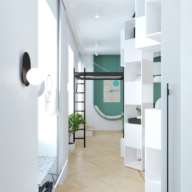 Rewitalizacja zabytkowej kamienicy w centrum Wiednia, zakładająca przebudowę wnętrz dawnego hotelu pracowniczego, oraz nadanie współczesnej funkcji zastanemu kontekstowi. Na projekt składają się cztery apartamenty pod wynajem krótkoterminowy. Dla inwestycji stworzono identyfikację wizualną, przyjmującą wykorzystanie przewodniego motywu kolorystycznego w każdym lokum, przy jednoczesnym zachowaniu spójności całego konceptu. Wyzwaniem projektowym był sam budynek niedostosowany do współczesnych warunków użytkowania, m.in. wąski trakt obiektu, brak sanitariatów w lokalach oraz problematyczna ekspozycja świetlna, lub jej brak we wnętrzach. Przeciwdziałając dzisiejszym niechlubnym standardom nieustannego pomniejszania przestrzeni życiowej, zdecydowano się na połączenie mniejszych kawalerek w przestronne, w pełni funkcjonalne mieszkania.