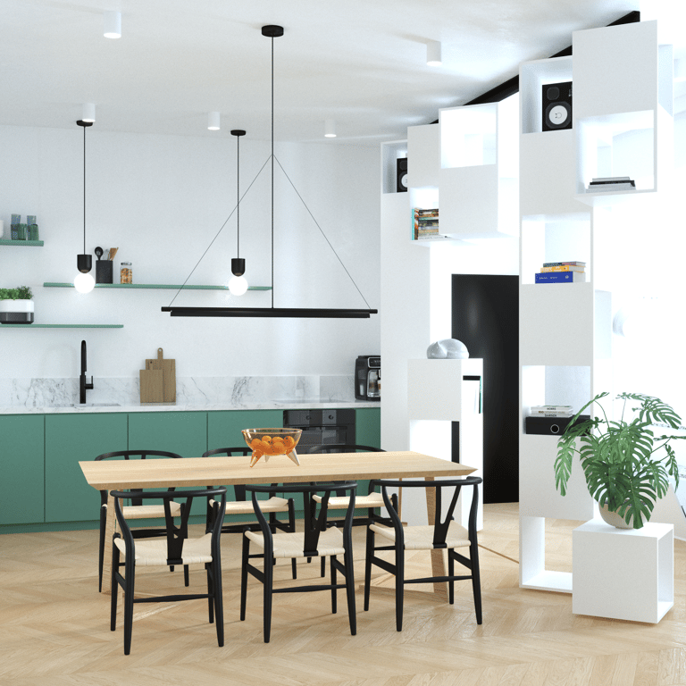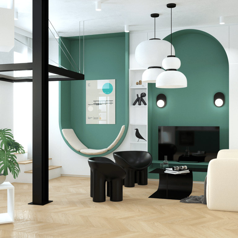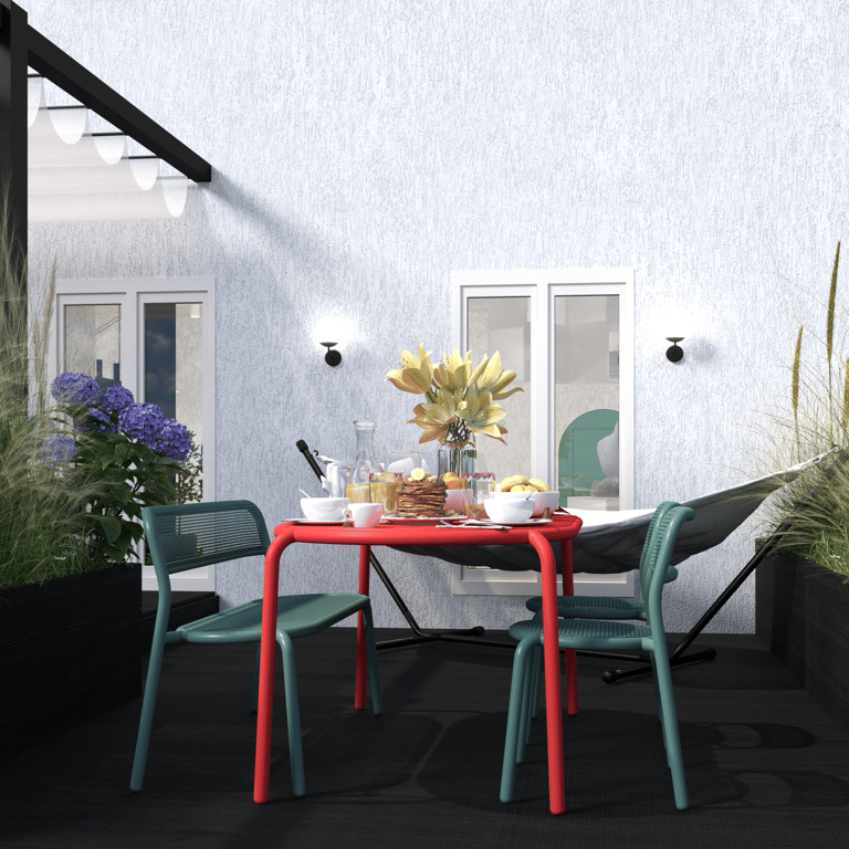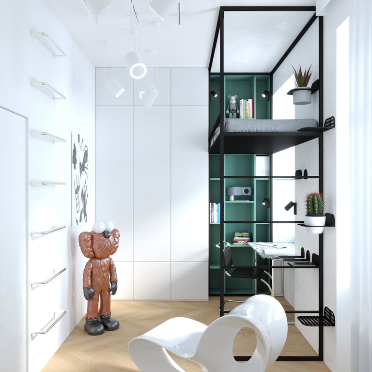 Hol wejściowy mieszkania połączony z przestronną strefą dzienną zaprojektowaną na otwartym planie z aneksem kuchennym oraz jadalnią. Salon zintegrowany z okazałym tarasem, tworzy rozległą, całoroczną przestrzeń wypoczynkową. Apartament przeznaczony dla pięciu osób, jednakże jego rozplanowanie w typie open space’u pozwala również na organizację imprez okolicznościowych. W projekcie zastosowano nieszablonowe rozwiązania jak m.in. wewnętrzny hamak, przesuwne meble modułowe czy podniesienie łóżek, w celu uzyskania dodatkowej przestrzeni do przechowywania oraz pracy.